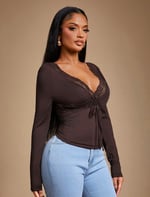 SKYNLYDRESS - Patchwork Col En V Sexy Décontracté Élégant Café Marron Dentelle pour Femmes